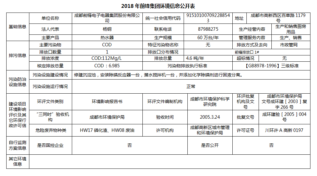 2018年前鋒集團環(huán)境信息公開表