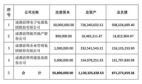 采取存續(xù)分立(派生分立)的方式,將公司分立為成都前鋒電子電器集團(tuán)股份有限公司(存續(xù)公司)、成都前鋒企業(yè)管理集團(tuán)股份有限公司、成都前鋒智能裝備股份公司、成都前鋒振興地產(chǎn)股份公司(公司實(shí)際名稱以市場監(jiān)督管理局核定為準(zhǔn))。
