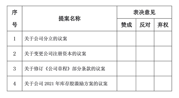 茲全權(quán)委托 先生(女士)代表本人出席成都前鋒電子電器集團(tuán)股份有限公司2021年第三次臨時股東大會,并于本次股東大會按照以下指示就下列議案投票,如沒有做出指示,代理人有權(quán)按自己的意愿表決。