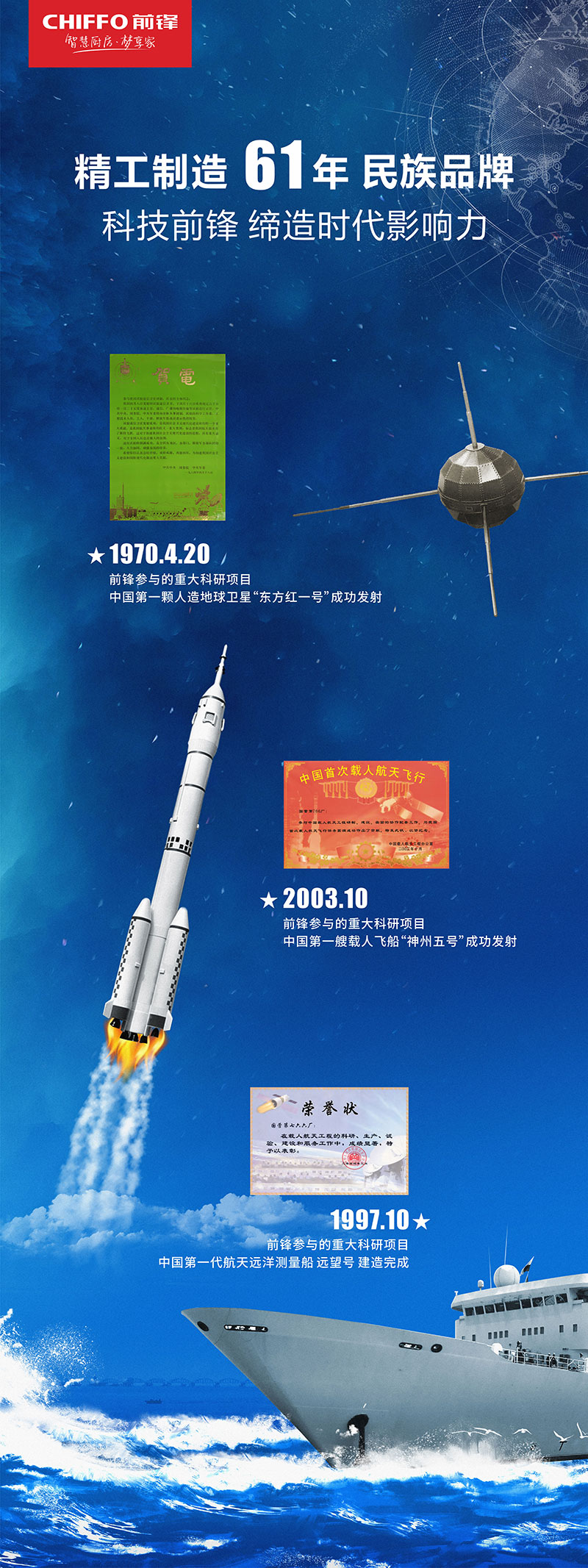 前鋒作為行業(yè)知名的技術(shù)先導(dǎo)型企業(yè),擁有六十一年的發(fā)展歷程,在新中國成立之后的這70年發(fā)展進(jìn)程中,緊隨國之發(fā)展,擔(dān)歷史使命,先后參與了眾多國家重大科研項目,其中包含中國第一顆人造衛(wèi)星“東方紅一號”成功發(fā)射,中國第一艘載人飛船“神舟五號”成功發(fā)射,中國第一代航天遠(yuǎn)洋測量船“遠(yuǎn)望號”建造完成等。
